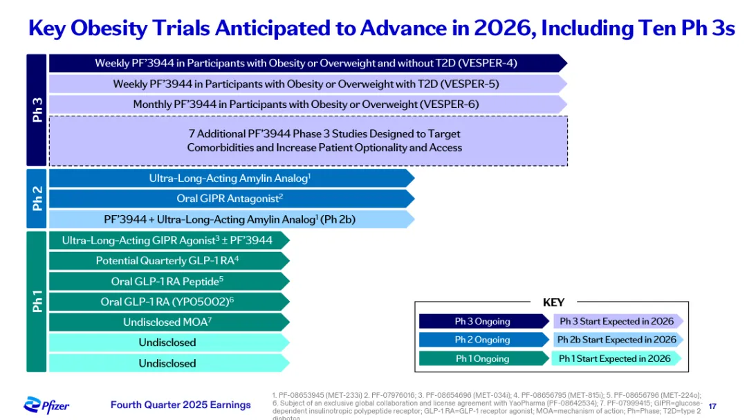 核心产品PF'3944 (MET-097i;长效全偏向性GLP-1R激动剂):计划开展共10项3期临床试验,例如近期启动的VESPER-4,该研究旨在评估每周一次PF'3944在肥胖或超重且无2型糖尿病患者中的疗效;计划开展的VESPER-5,该研究旨在评估每周一次PF'3944在肥胖或超重且患有2型糖尿病患者中的疗效;以及计划开展的VESPER-6,该研究旨在评估每月一次PF'3944在肥胖或超重患者中的疗效。此外,PF'3944 还计划开展至少七项 3 期研究,旨在治疗合并症。