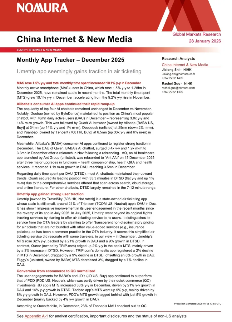 美团 (Meituan): 主App时长出现拐点,MTS同比下降1%,DAU下降7% 。其面向商家的App(餐饮与酒旅)MTS也均下降了7% 。
