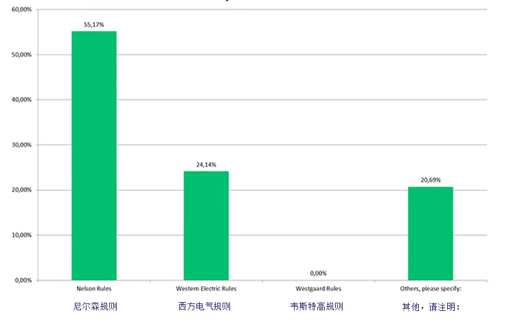 关于使用何种统计方法的回答也很有意思:尼尔森规则以 55% 的占比位居第一,其次是西方电气规则(24%);没有参与者使用韦斯特高规则;“其他” 类别占比也达到 21%,具体包括:控制限与规格限的对比、Minitab 统计工具中默认规则的使用、不同规则的组合、戴明规则。