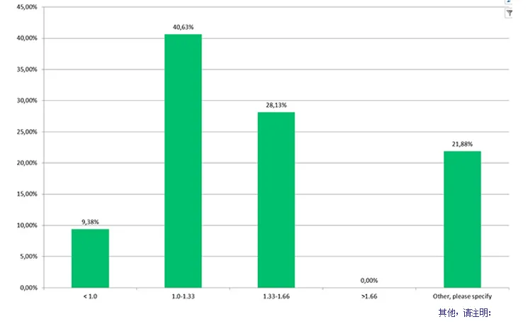 85% 的参与者会使用过程能力指数。其中 41% 的人将限值设定在 1.0 至 1.33 之间,28% 的人要求更高,选择了 1.33 至 1.66 的限值;另有 9% 的参与者接受 1.0 的数值。“其他” 选项(22%)的备注包括:>1.33、取决于数据量、不用于工艺验证报告(PQR)或生产、≥1.0。