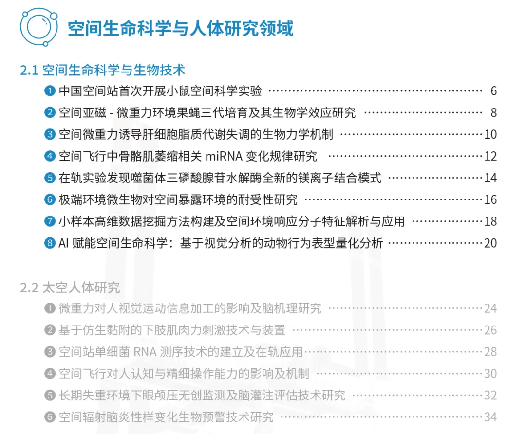 在空间生命科学与人体研究领域,围绕空间基础生物学、空间生物技术及转化应用、空间生命生态、生命起源与交叉等方面开展研究,成功实现了中国空间站首次小鼠空间科学实验;国际首次开展空间站亚磁- 微重力复合太空环境生物学研究;在轨实验发现噬菌体三磷酸腺苷水解酶全新的镁离子结合模式;通过舱外暴露实验获得了耐辐射能力增强的细菌突变株;开发中国空间站首个AI 赋能的多物种姿态估计与跟踪基准数据集。