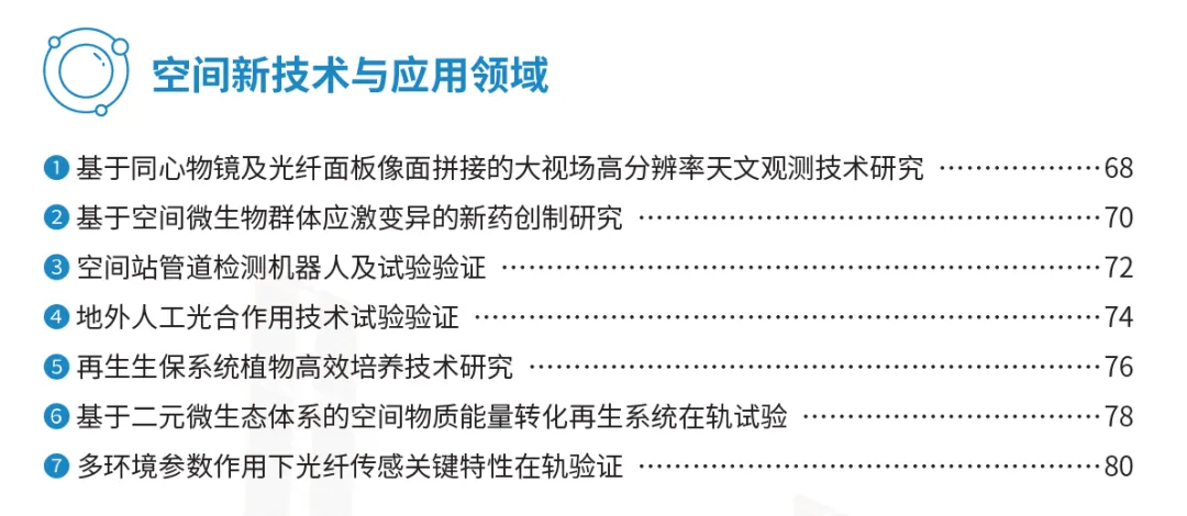 在空间新技术与应用领域,突破了同心物镜及光纤面板像面拼接的大视场高分辨天文观测技术;国际首次开展空间站管道检测机器人在轨试验,验证了管道检测机器人的管道环境适应能力和变刚度运动安全性等。