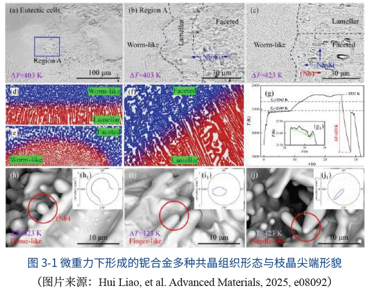 成功实现了铌合金、锆合金等超高温金属材料的空间无容器凝固实验。研究揭示了空间流体对枝晶和共晶生长模式的动力学局域效应(图3-1):在微重力下,马兰格尼对流主导的局域流动
