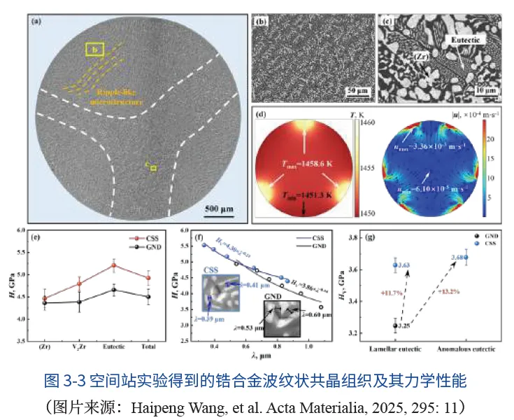 (图3-3),在胞内波纹状组织和胞外层片共晶的共同作用下,合金获得了优异的强度塑性匹配,其硬度和弹性模量均显著提升。这些在地面重力环境中被自然对流所掩盖的新现象与新机制,拓展了人们对传统凝固中共晶与枝晶生长的新认知,为发展在轨材料制备技术奠定了关键的科学基础。相关成果发表于Advanced materials(先进材料)、Acta materialia(材料学报)、Journal of applied physics(应用物理期刊)等国际期刊。