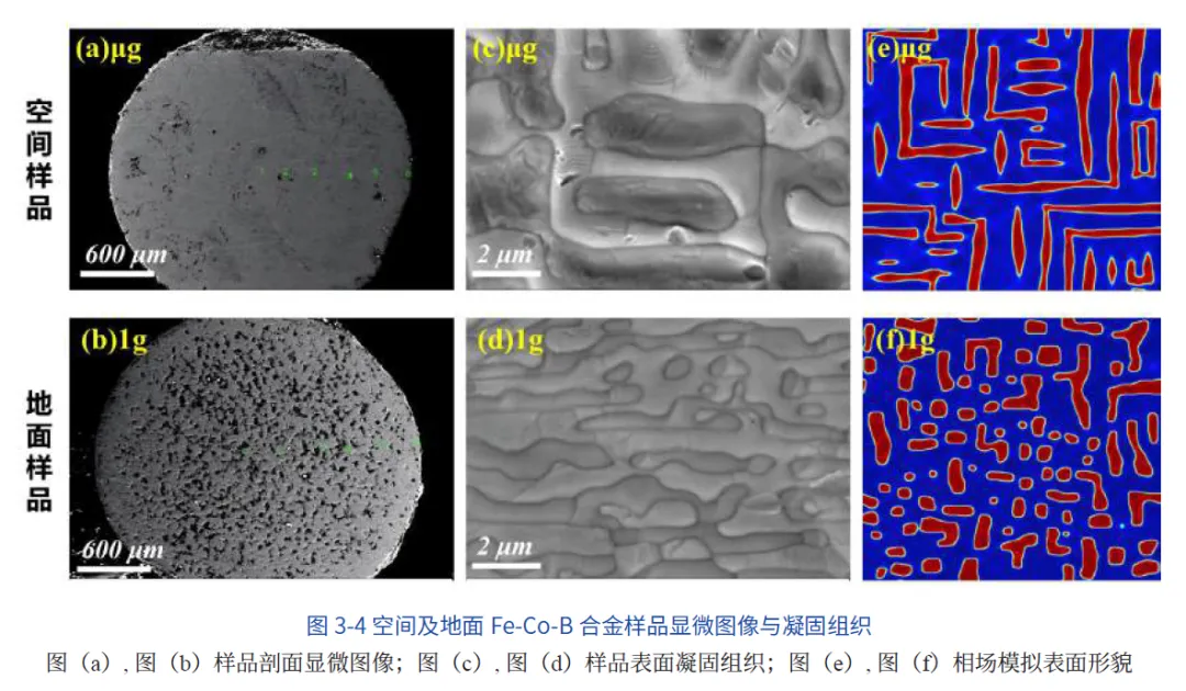 开展了铁基磁致伸缩合金的空间凝固实验,获得了比地面样品质量更好、更致密的铁钴硼(FeCoB)合金样品。通过微观组织表征和相场模拟发现,微重力条件下获得的样品共格应变能较大,有利于形成平直的共格界面;而地面条件下共格应变能较小,易形成具有高曲率的非共格界面。这表明,微重力条件下获得的样品与地面制备的样品相比,表面可以呈现出不同的相界形貌(图3-4)。