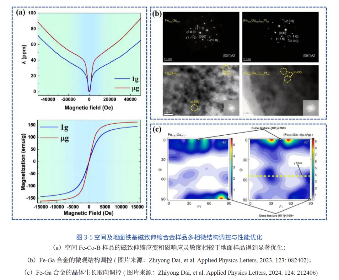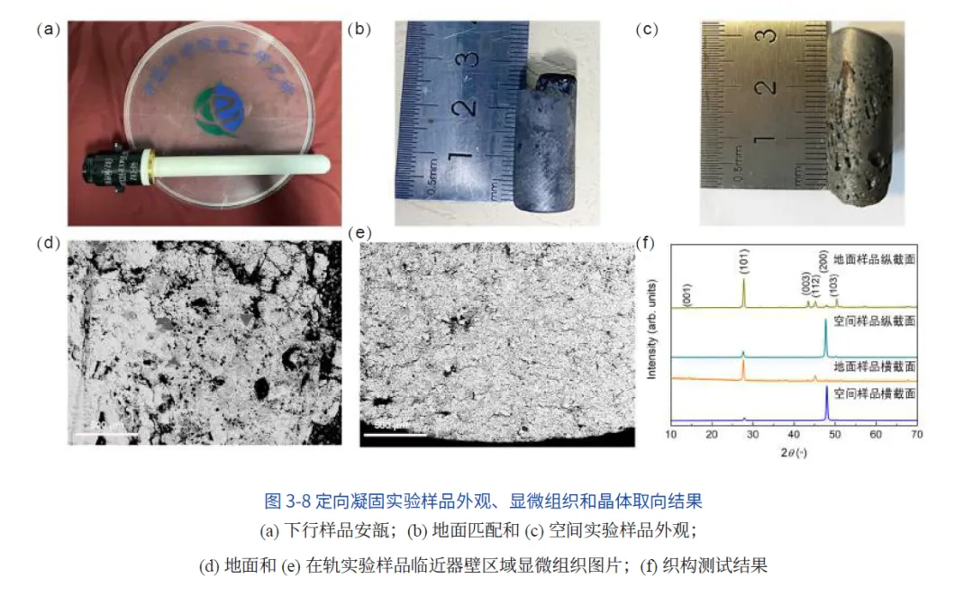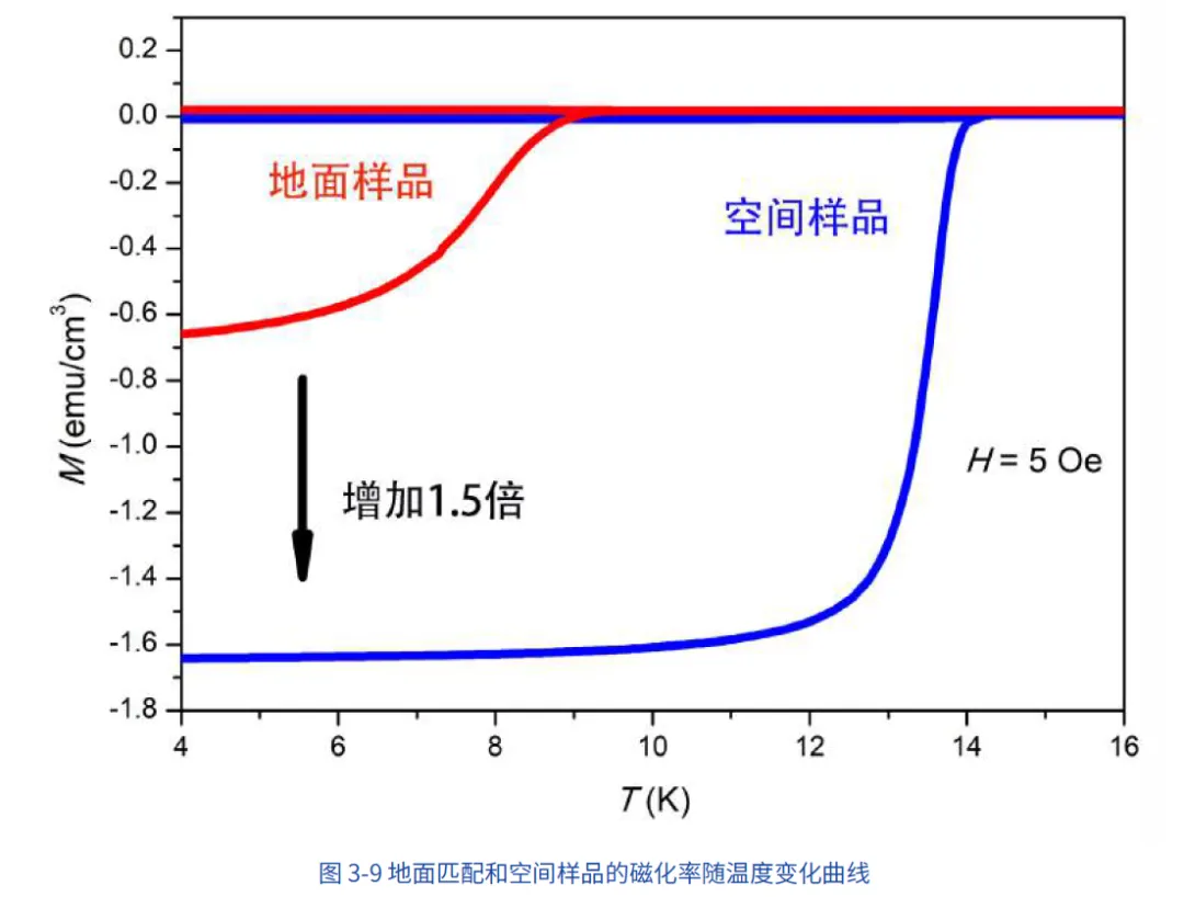 在轨实验获得了地面难以实现的大尺度准双轴织构定向凝固棒材。棒材的显微结构分析表明,微重力环境显著抑制了快速定向凝固过程中的晶体缺陷形成,在纯扩散主导的生长机制下间隙铁原子密度明显降低,材料的超导体积分数达到地基样品的两倍以上,超导性能获得显著提升(图3-9)。