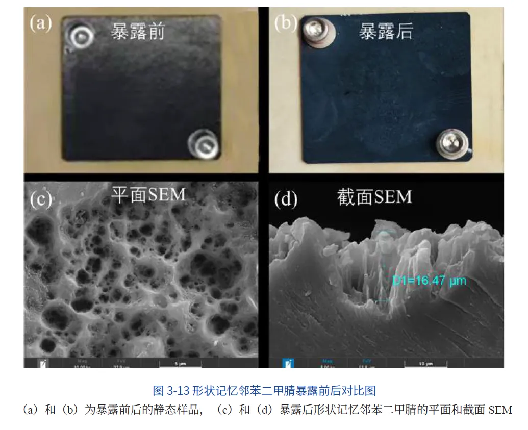 筛选了可应用于空间可展开结构和在轨锁紧释放结构的优质基材。对比分析地面样品和在轨暴露不同时间样品的微观形貌、材料性能等变化(图3-13)