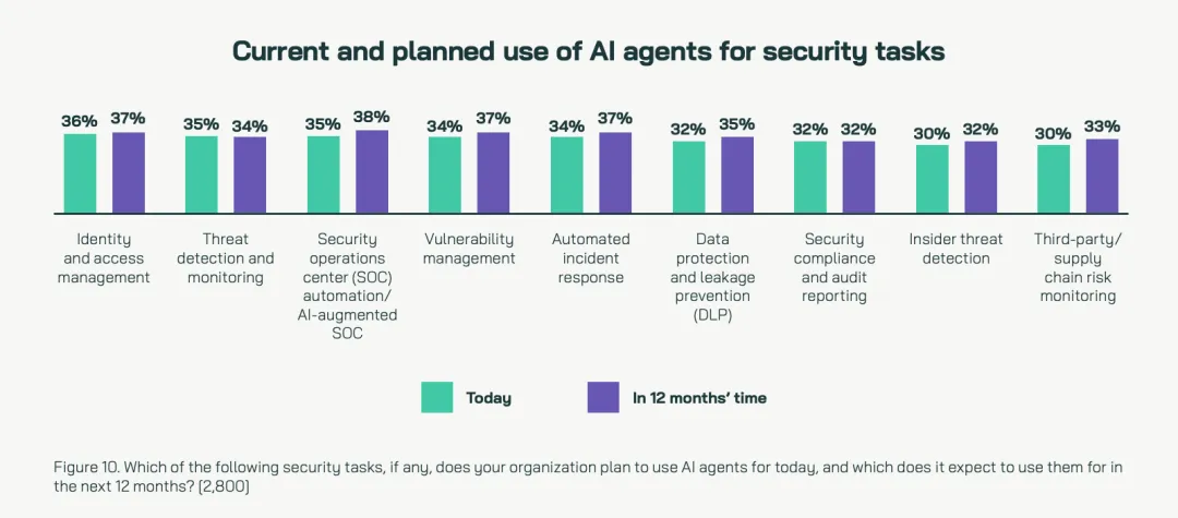 在具体的安全任务中,AI Agent的应用正在提速。报告指出,约38%的企业计划在未来12个月内正式部署AI增强型安全运营中心。通过将AI Agent集成到工作流中,团队能够更早发现异常并更快遏制数据泄露,同时减少处理常规任务带来的重复性工作。