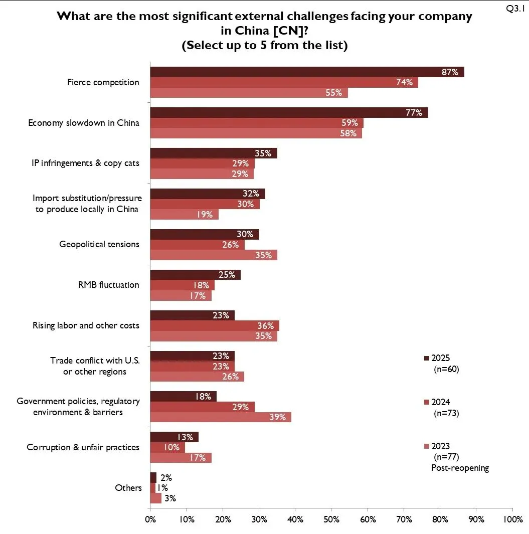 关于调查结果,短期商业信心在2025年调查中再次下滑,反映了内需放缓、成本压力以及日益激烈的竞争。60% 的受访者将近期市场环境描述为极具挑战性。与此同时,有迹象表明法律和监管环境正在改善。