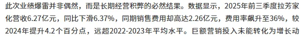 2025年前三季度,拉芳家化营收6.27亿元,同比下滑6.37%,但销售费用却高达2.26亿元,费用率飙升至36%,较2024年提升4.2个百分点,远超2022-2023年平均水平。