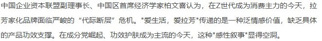 品牌老化与代际断层是拉芳家化的又一难题。据《野马财经》报道,知名危机公关专家詹军豪指出,“爱生活,爱拉芳”这句经典口号虽承载情怀记忆,但品牌主张过于泛化,难以触达追求个性与品质的Z世代消费者。在中国企业资本联盟副理事长柏文喜看来,在成分党崛起、功效护肤成为主流的今天,拉芳依赖的“感性叙事”显得空洞乏力,品牌面临严峻的“代际断层”危机。