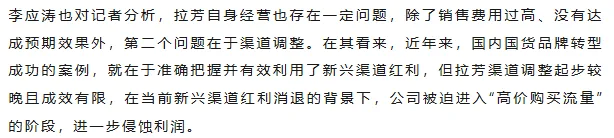 据《华夏时报》报道,嘉世咨询合伙人李应涛分析指出,近年来国内国货品牌转型成功的案例,在于准确把握并有效利用了新兴渠道红利,但拉芳渠道调整起步较晚且成效有限。在当前新兴渠道红利消退的背景下被迫进入“高价购买流量”的阶段,进一步侵蚀利润。更严重的是,其线上运营仅停留在营销层面,缺乏自播体系与私域运营能力,依赖头部主播与明星代言带来的流量难以持续。