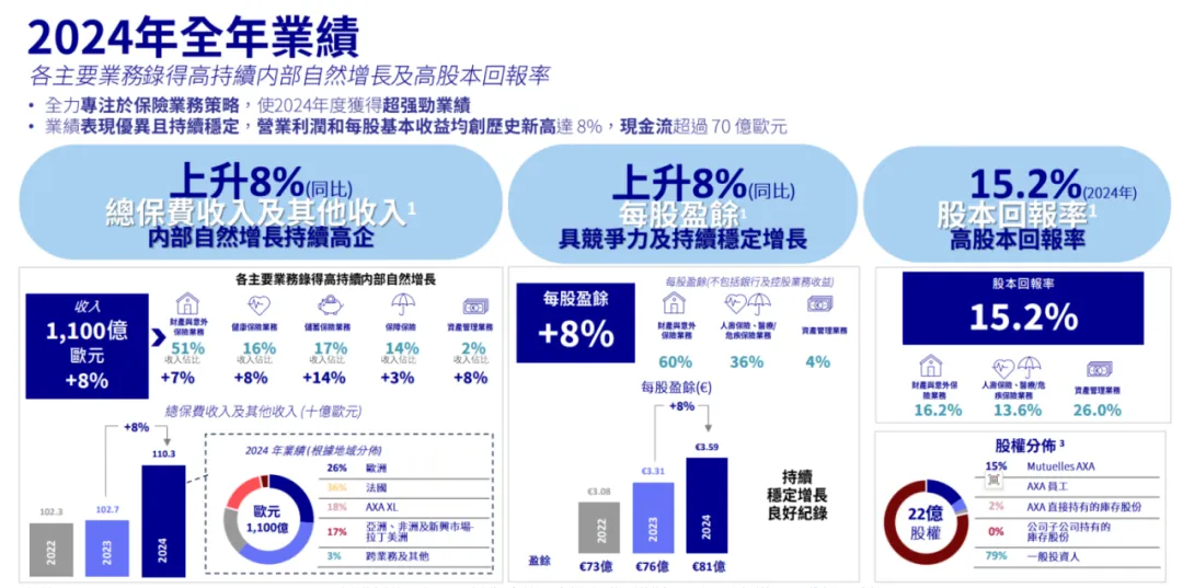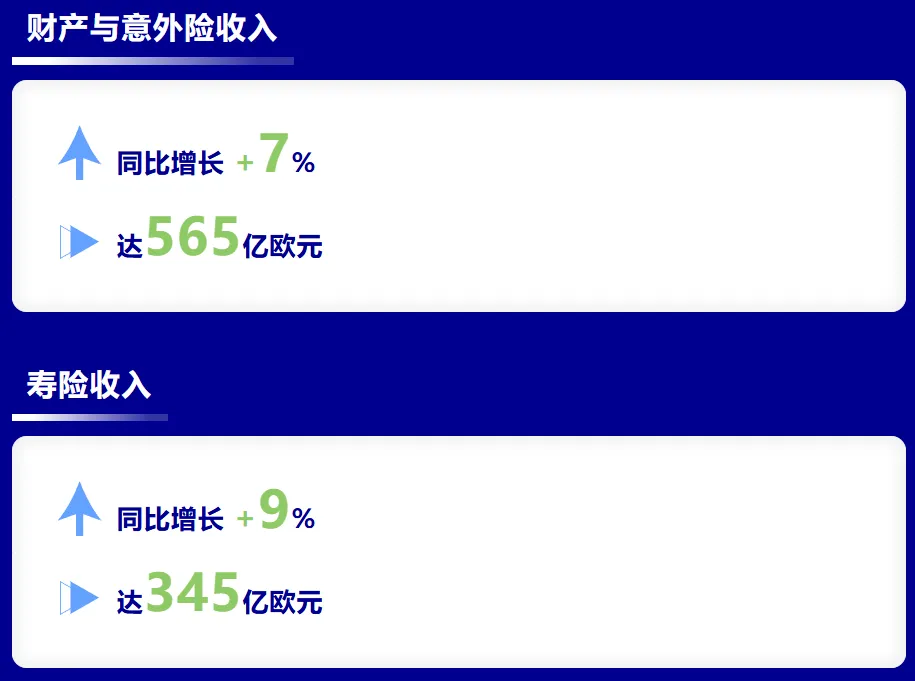 财产与意外险收入达565亿欧元,同比增长7%;寿险险收入达345亿欧元,同比增长9%;健康险收入175亿欧元,同比增长8%。