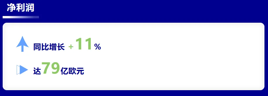 全年总收入达1100亿欧元,同比增长8%,每股综合收益达3.59亿欧元,同比增长8%;同时,净利润79亿欧元,同比增长11%。