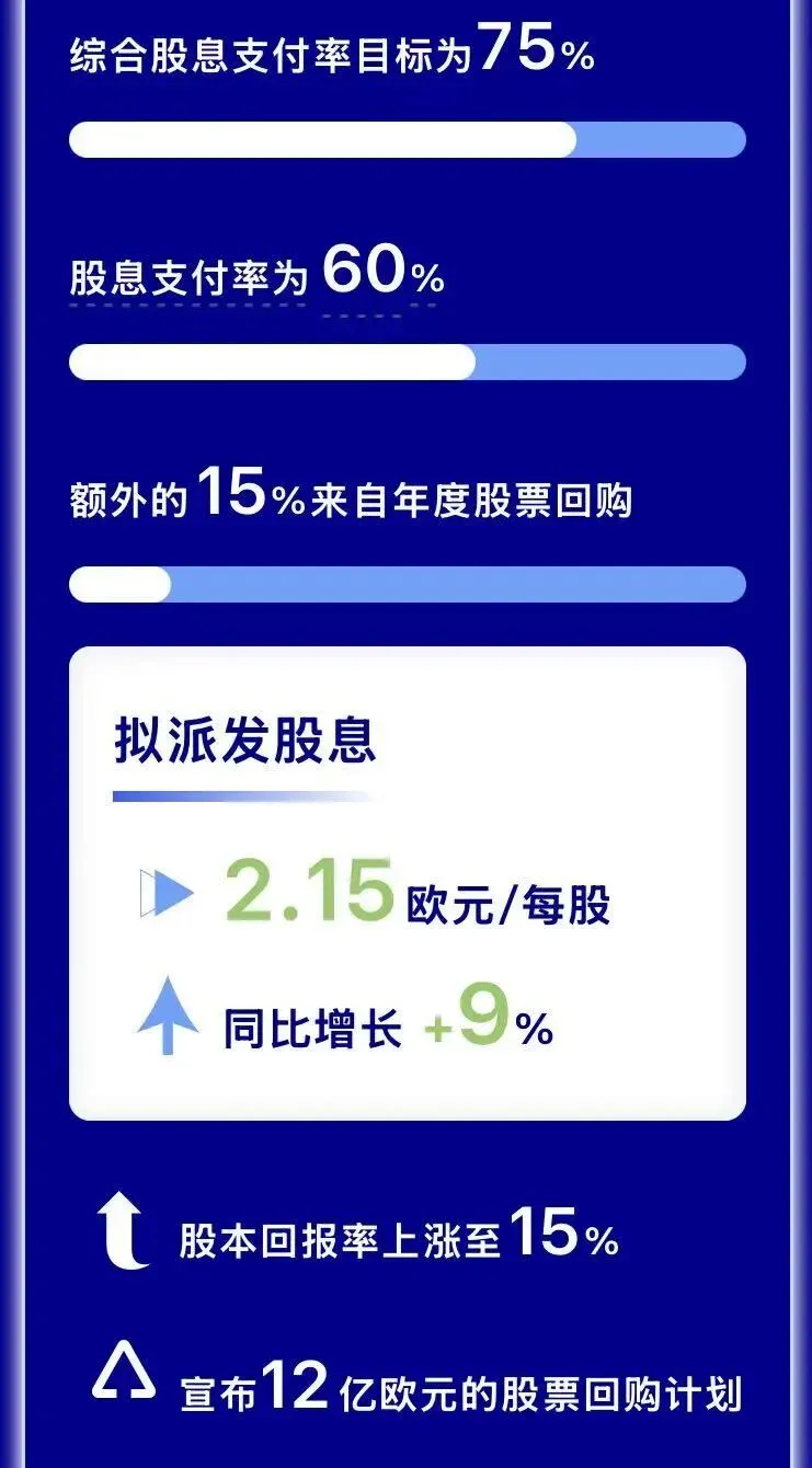 综合股息支付率目标为75%,每股股息2.15欧元,同比上涨9%,同时推出最高12亿欧元的股票回购计划,与投资者共享增长红利。
