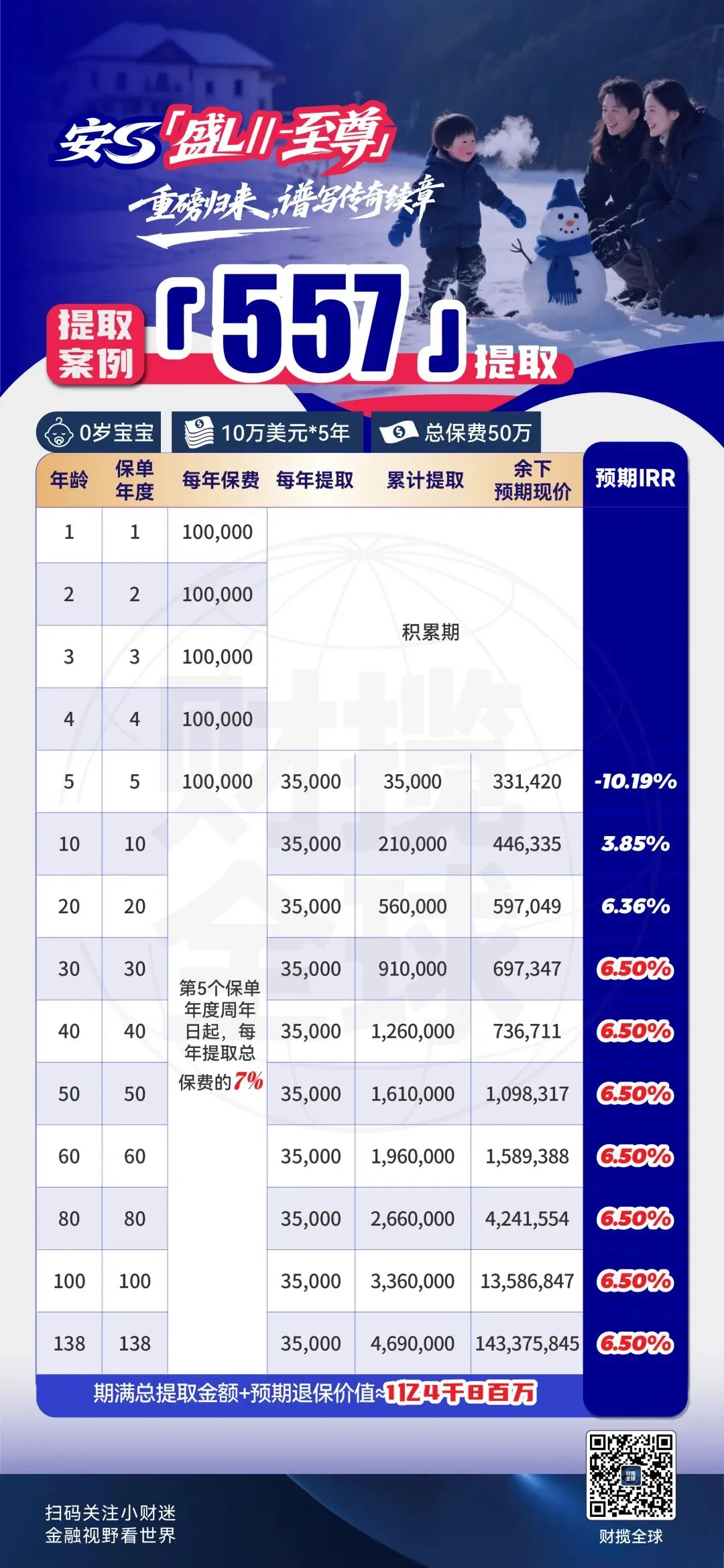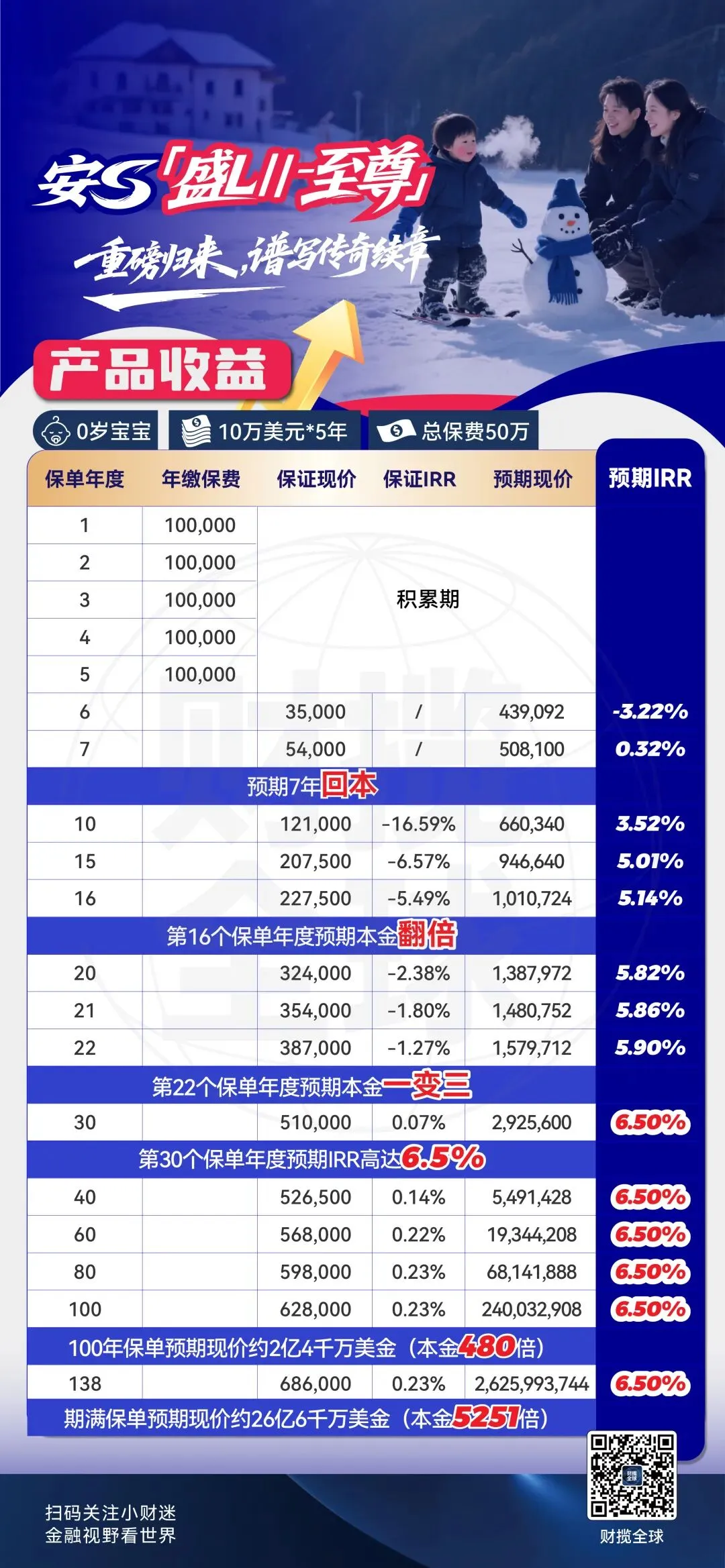 5年缴费7年回本,10年预期IRR达3.52%,30年登顶6.50%,美元/加元/澳元保单每10年财富翻倍。