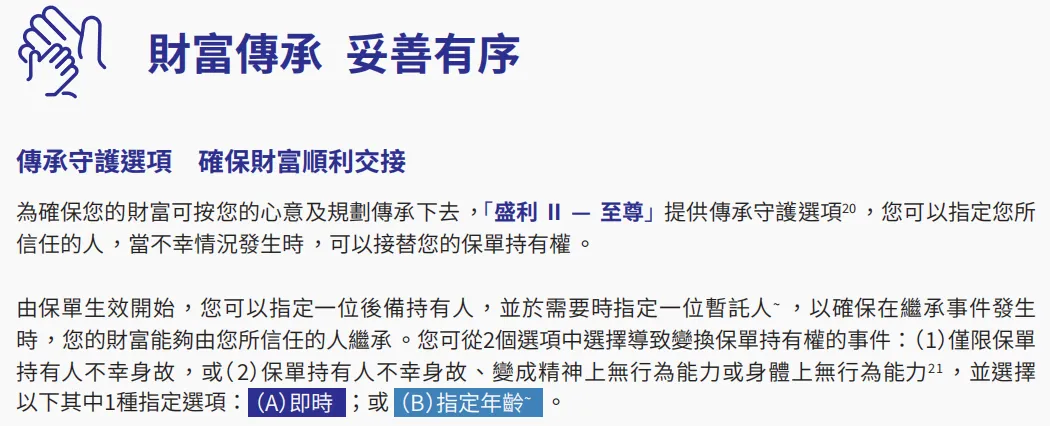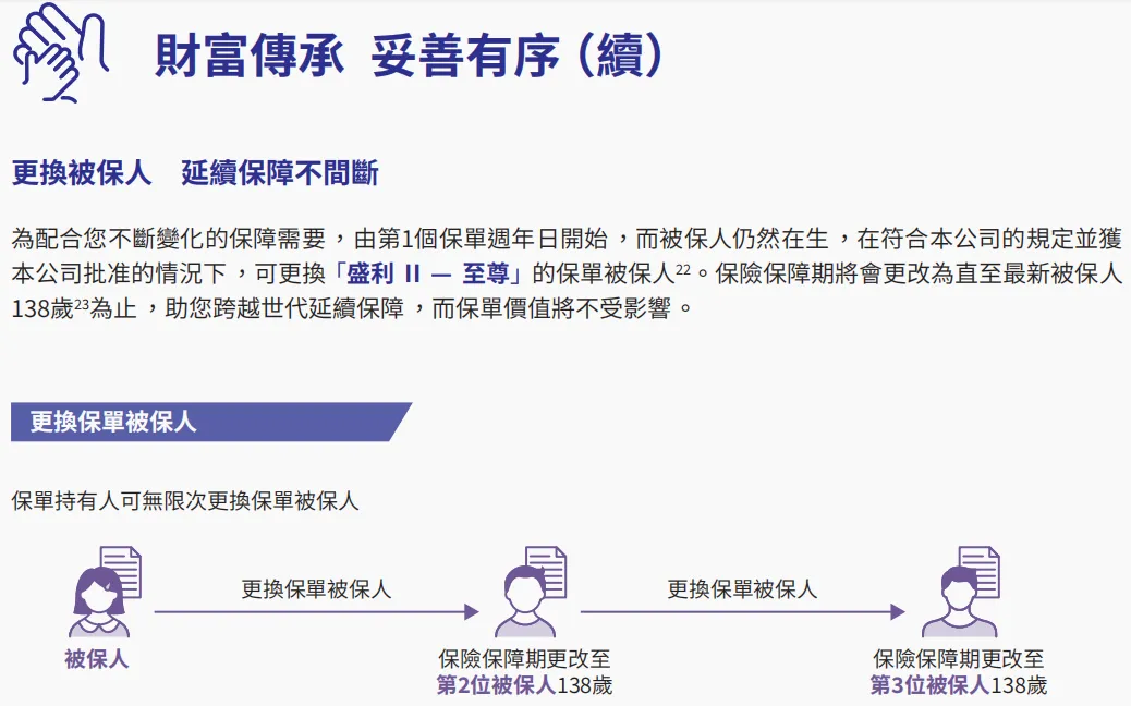 支持无限次更换受保人、指定后备持有人与暂托人功能,高效规划财富传承。