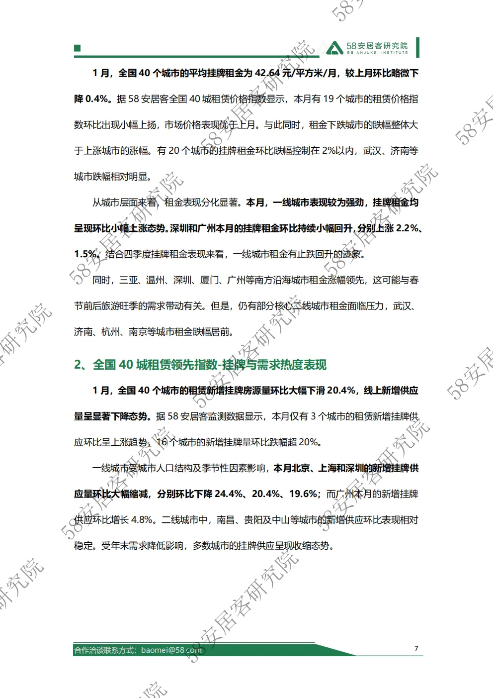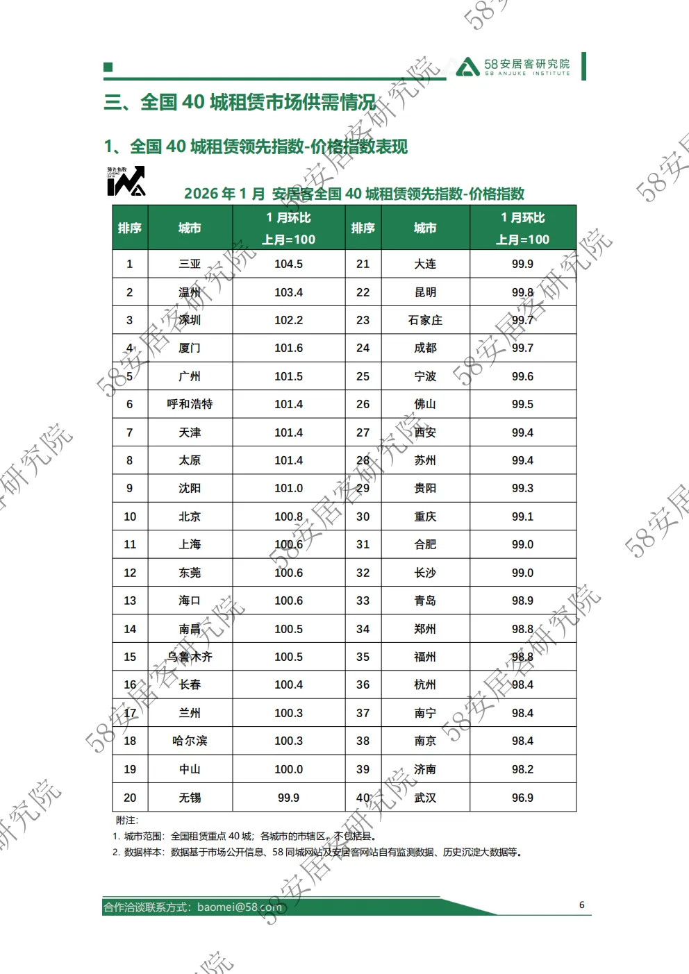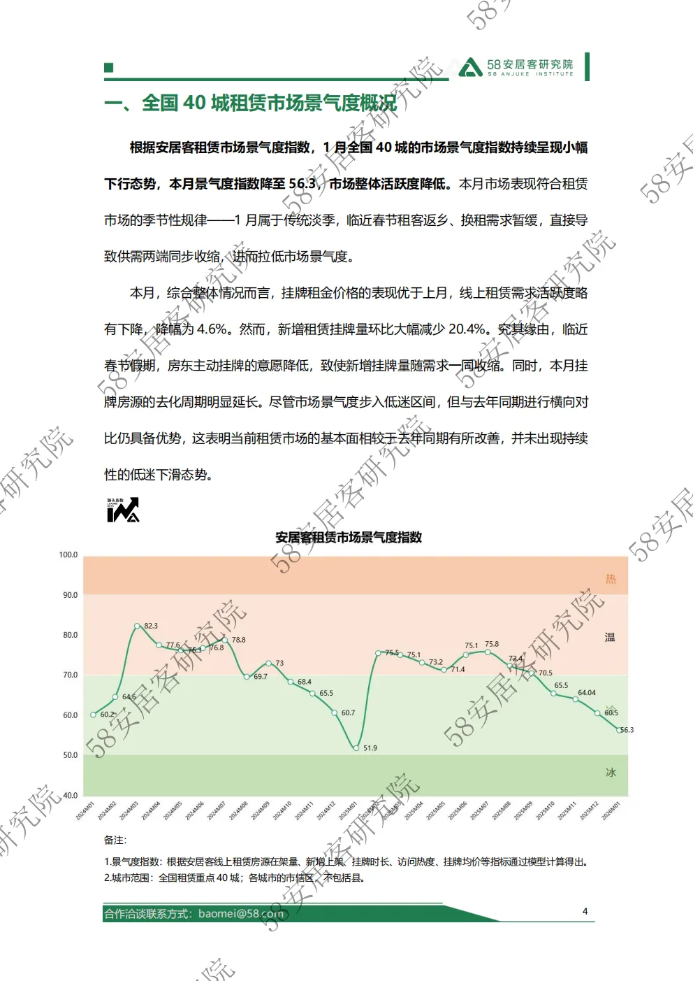 根据安居客租赁市场景气度指数显示,1月全国40城的市场景气度指数持续呈现小幅下行态势,本月景气度指数降至56.3,市场整体活跃度降低。
