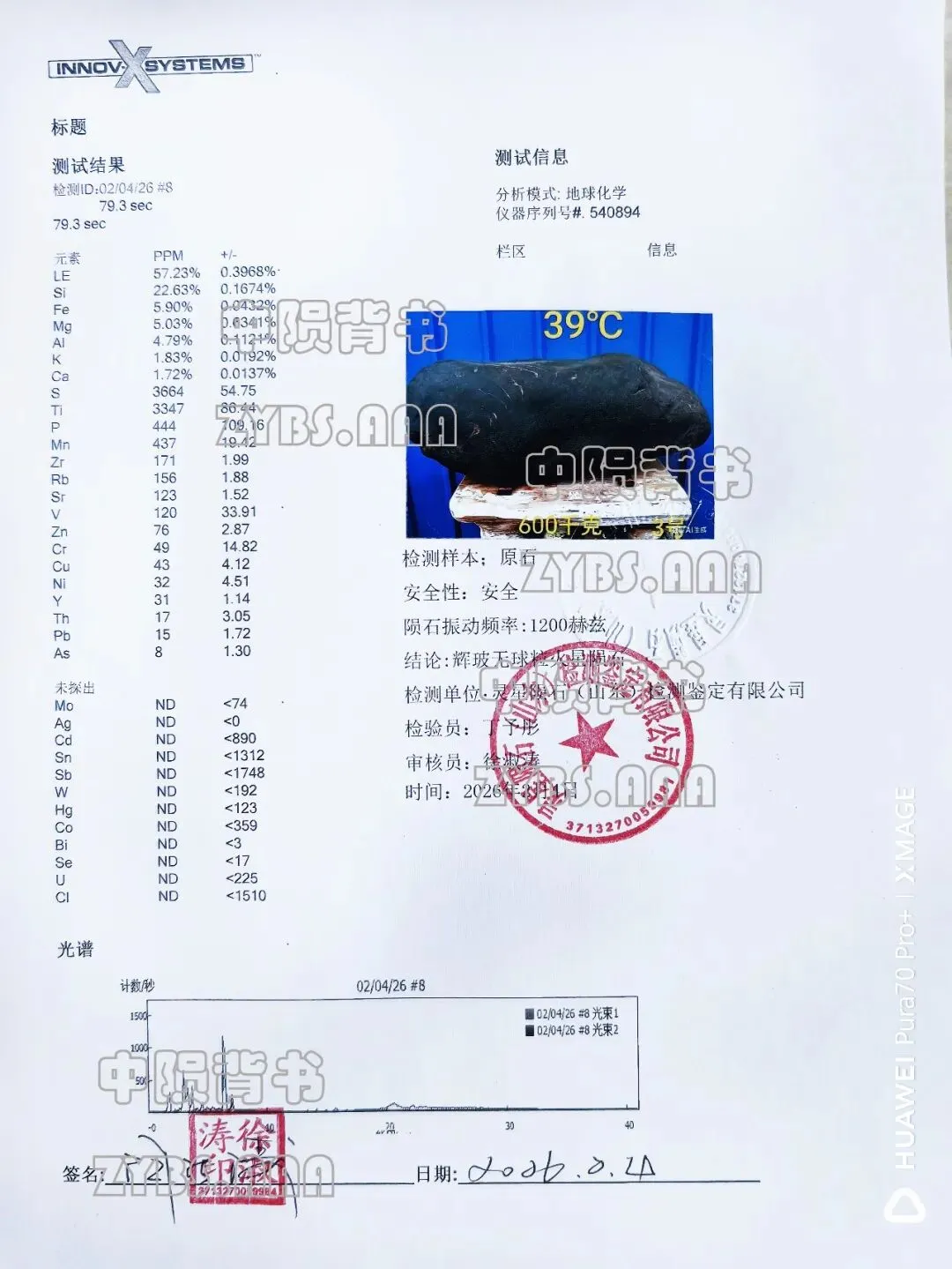 振动频率:经专业仪器检测,其振动频率为1200赫兹,与已知火星陨石的振动频率范围(1000-7000赫兹)高度吻合,显著高于月球陨石(600-800赫兹)及多数小行星陨石,进一步佐证了其火星来源。