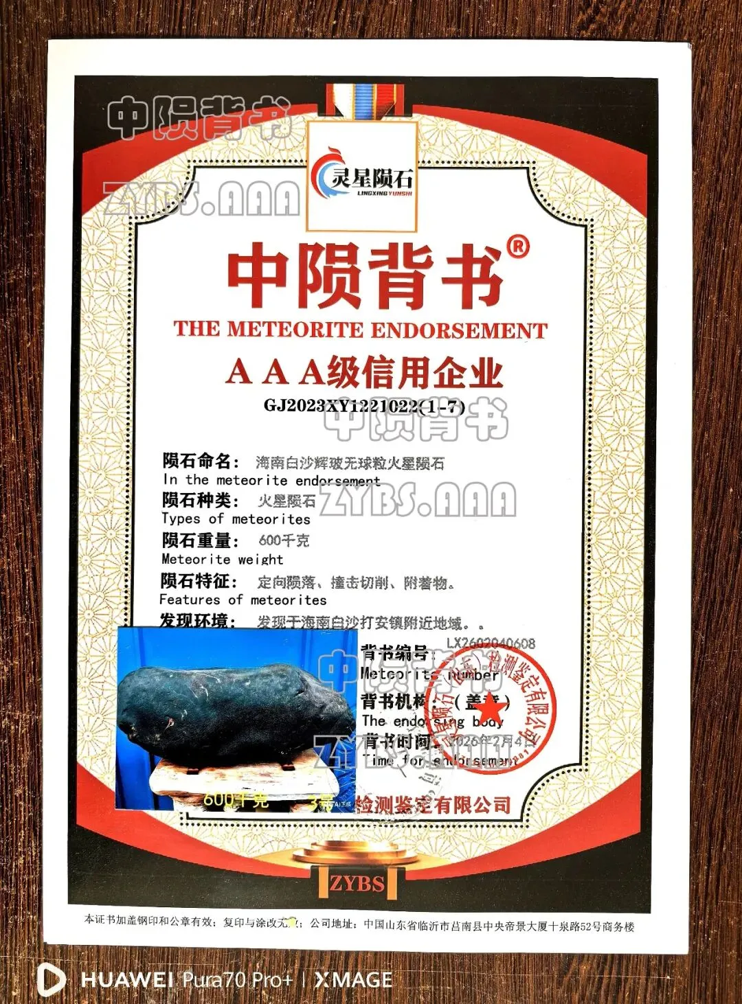 地域稀缺性:该陨石发现于我国海南白沙,是我国华南热带地区首次发现的大型辉玻无球粒火星陨石,地域独特性显著,进一步提升了其收藏价值与市场竞争力。