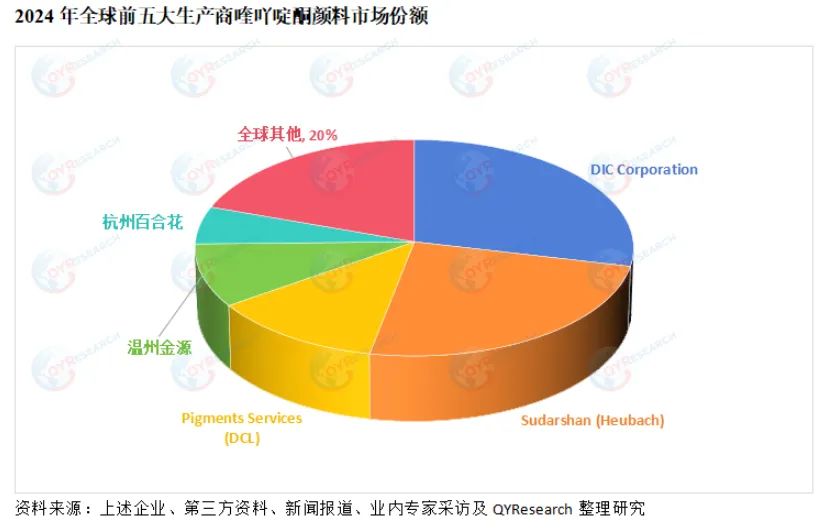从生产商来说,全球范围内,喹吖啶酮颜料核心厂商主要包括DIC Corporation、Sudarshan (Heubach)、Pigments Services (DCL)、温州金源和杭州百合花等。2024年,全球第一梯队厂商主要有DIC Corporation和Sudarshan (Heubach),第一梯队占有大约53%的市场份额;第二梯队厂商Pigments Services (DCL)、温州金源、杭州百合花、浙江永泉和信凯科技等,共占有34%份额。