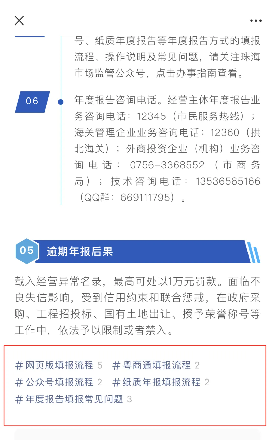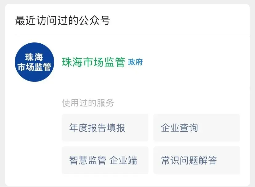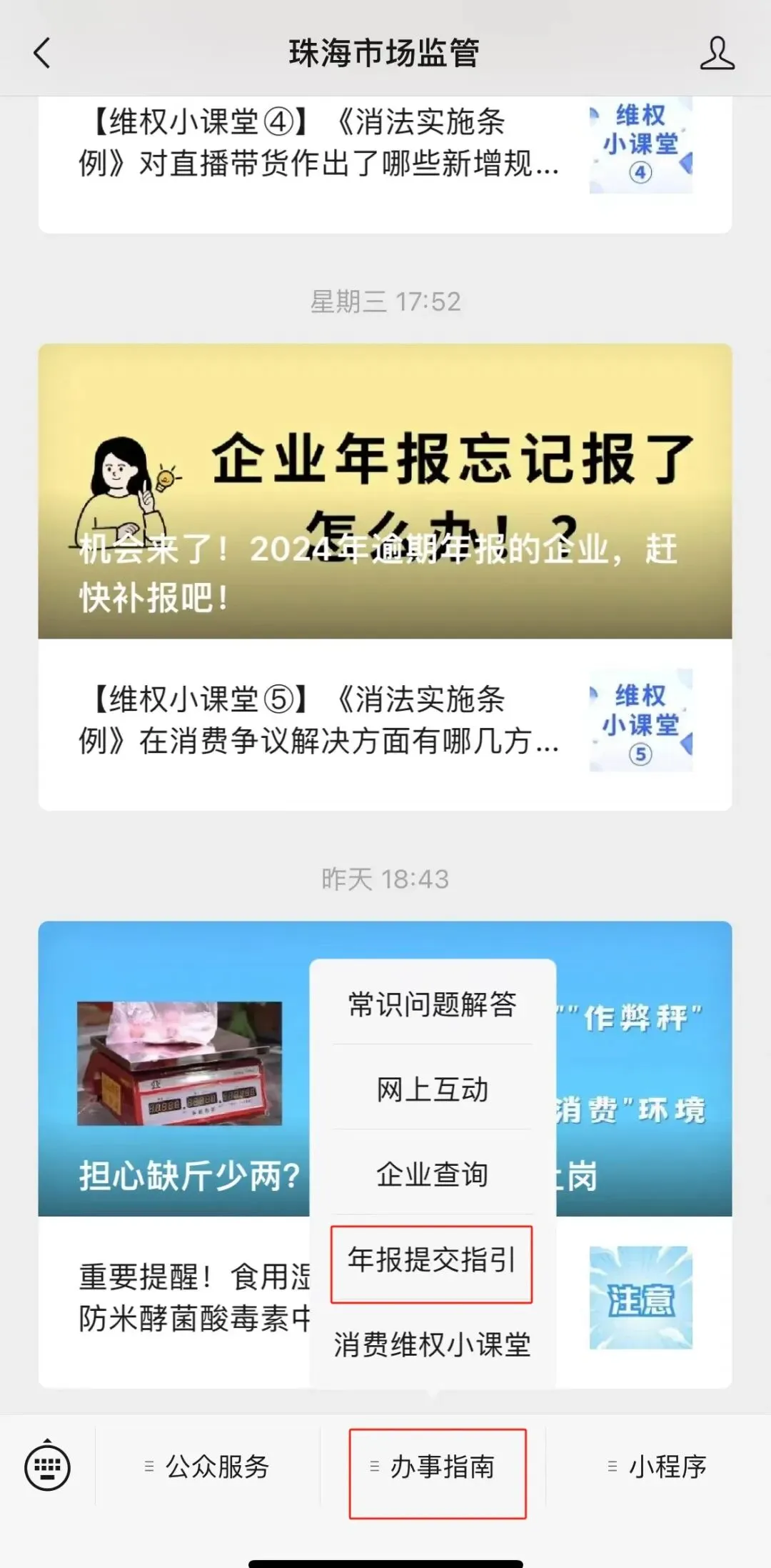 ①详细操作步骤,请关注珠海市市场监管局微信公众号,点击公众服务,再点击年报提交指引。如下图