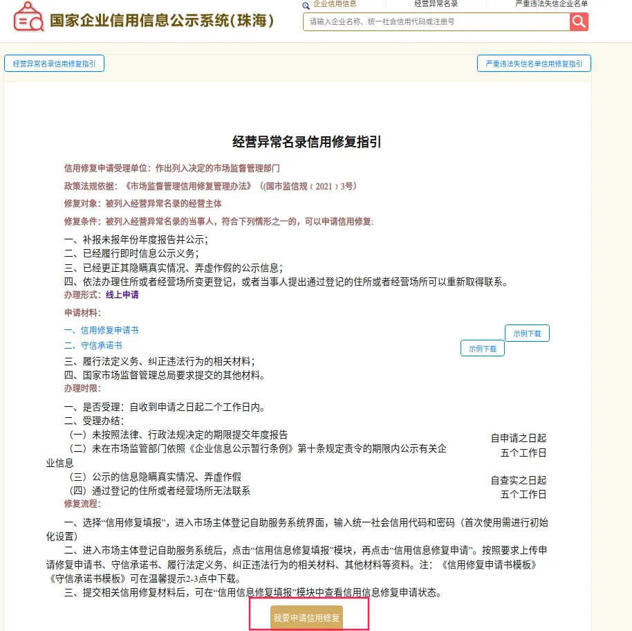 ②点击“信用修复填报”,在“经营异常名录信用修复指引”界面点击我要申请信用修复。
