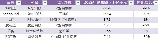派威妥(镥[177Lu]特昔维匹肽):销售额飙升42%至20亿美元,在前列腺癌市场持续受到青睐。