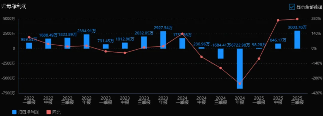 2)归母净利润2025年三季度的归母净利润为3003.70万元,相较于2024年三季度的-1684.41万元,实现了由亏转盈,同比增长278.32%。公司盈利能力明显改善,经营状况好转。