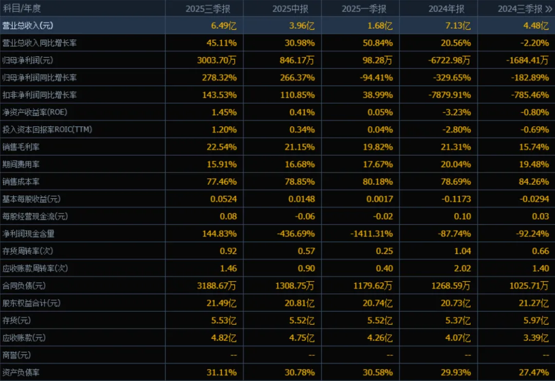 9)应收账款和存货2025年三季度的应收账款为4.82亿元,较2024年三季度的3.39亿元有所上升,可能与收入增长有关;存货为5.53亿元,较2024年三季度的5.97亿元有所下降,库存管理有所优化。