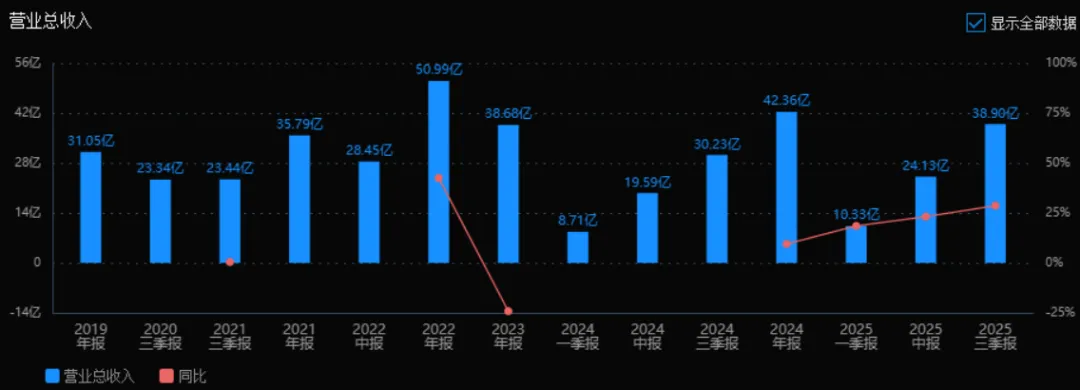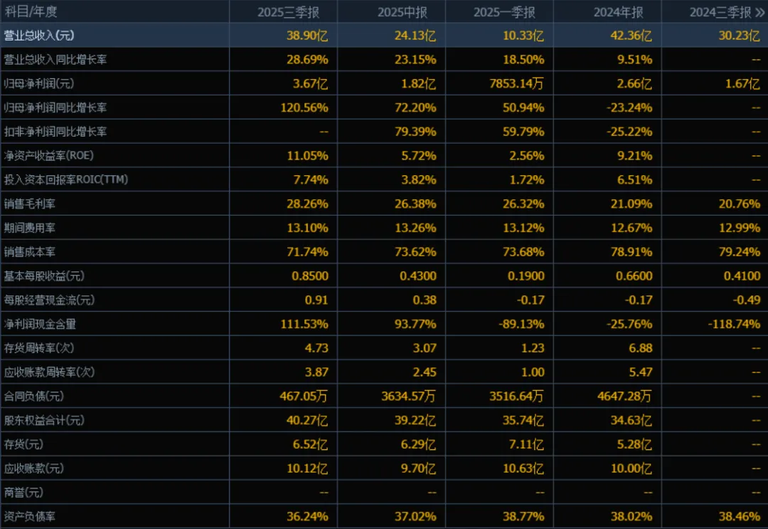 1)营业总收入:2025年三季度的营业总收入为38.90亿元,相较于2024年三季度的30.23亿元,增长约28.69%。评价: 收入增长明显,且增速逐季提升(从一季报的18.50%到三季报的28.69%),显示公司业务扩张态势良好。