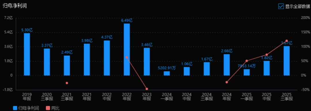 2)归母净利润:2025年三季度的归母净利润为3.67亿元,相较于2024年三季度的1.67亿元,大幅增长约119.76%(表中为120.56%)。评价: 净利润增速远高于收入增速,说明公司在盈利能力方面有明显改善,尤其是相较于2024年净利润下滑的情况,2025年表现强劲。