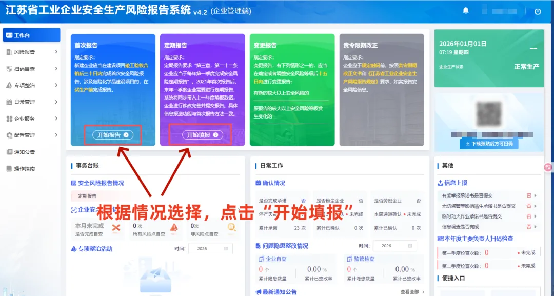 根据《江苏省生产经营单位安全风险管理条例》(江苏省人大常委会公告2024年第17号)第十四条及《江苏省工业企业安全生产风险报告规定》(省政府令第140号)第二十二条规定,工业企业应当于每年第一季度完成较大以上安全风险报告;新设立的生产经营单位应当在投入生产经营前完成首次较大以上安全风险报告。2026年度全省工业企业安全生产风险定期报告工作已正式启动。