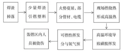 焊接作业过程中产生的焊渣通过设备安装孔从4楼往3楼掉落,金属焊渣与3楼包装塑料袋等可燃物发生接触引燃并蔓延,磺胺在高温环境下形成挥发分与氧气混合形成的气团,在明火作用下发生轰燃,导致车间内猛烈燃烧。
