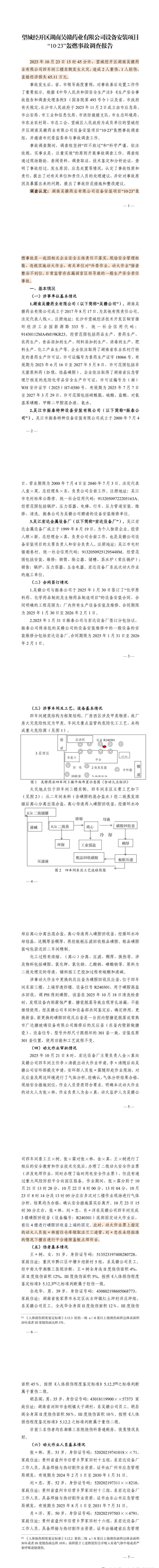 2025年10月23日15时45分许,望城经开区湖南吴赣药业有限公司四车间三楼东侧发生火灾,造成2人重伤、1人轻伤,直接经济损失65.11万元。