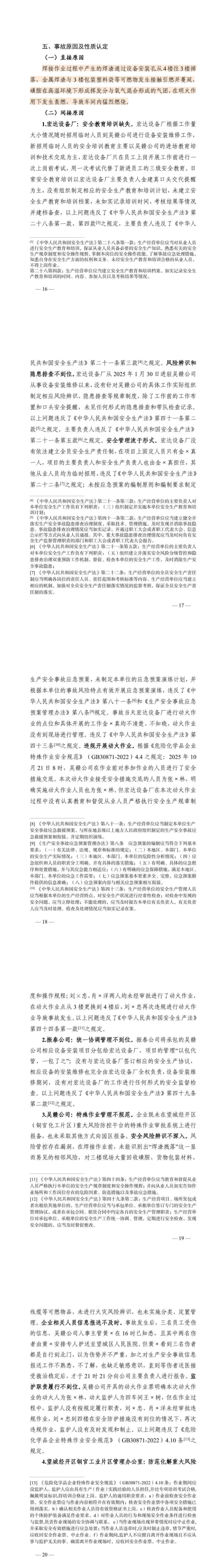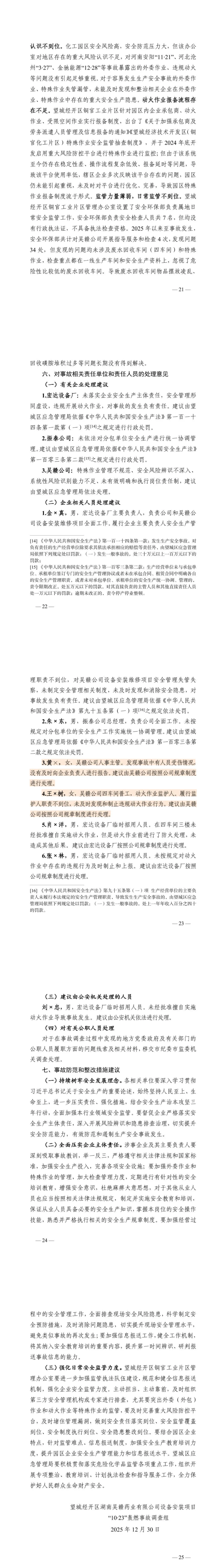 调查认定:湖南吴赣药业有限公司设备安装项目“10·23”轰燃事故是一起因相关企业安全主体责任不落实、现场安全管理松散、违规实施动火作业,有关单位对“外委作业、动火作业”排查整治不到位,日常监管存在漏洞盲区而导致的一般生产安全责任事故。