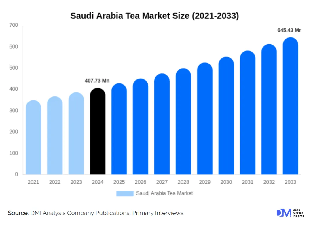 沙特阿拉伯是全球重要的茶叶消费国,其市场正从稳定的日常必需品消费,向以健康化、高端化和体验化为特征的现代消费转型。本报告基于多维数据指出,沙特茶叶市场在“量稳价升”的态势下持续增长:消费量稳定在年近4万吨,而市场价值正以约5.26%的年复合增长率扩张,预计从2024年的4.077亿美元增至2033年的6.454亿美元。