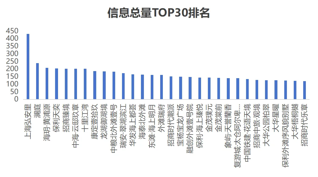 在322个监测项目中,数据总量最多的为上海弘安里,共监测到430条信息,市场关注度较高,反映出购房者对热门楼盘持续保持兴趣。