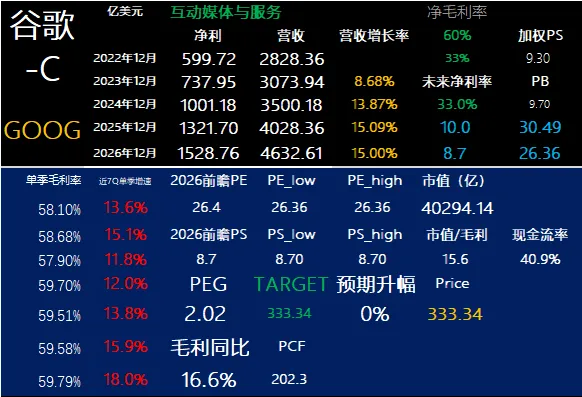 连续4个季度毛利总额2403亿,历史新高;连续4个季度利润总额1321亿,历史新高!2025年PE大约30x左右。2026年的前瞻PE大约是26x左右。具体要看开支折旧以及核心业务的增长情况。
