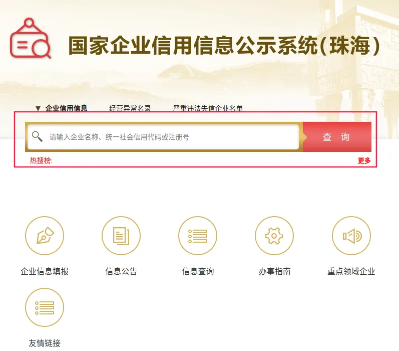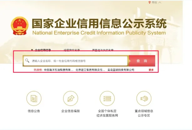 ②在首页查询条框中输入企业名称/统一社会信用代码/注册号,点击查询。
