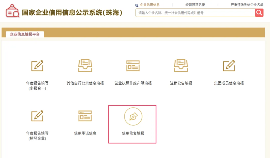 ②点击“信用修复填报”,在“经营异常名录信用修复指引”界面点击我要申请信用修复。