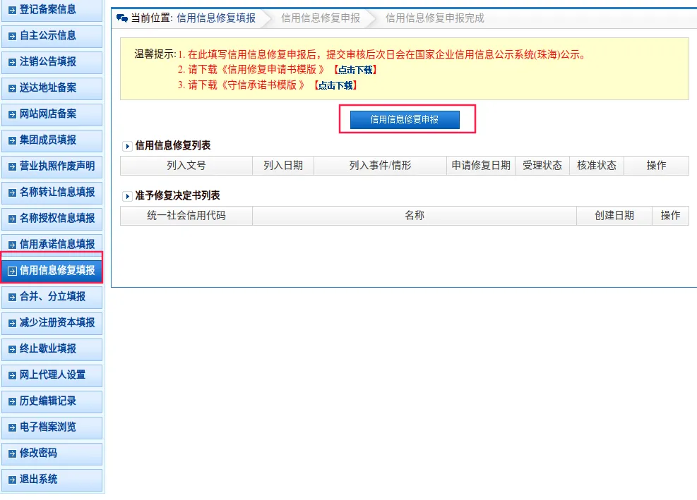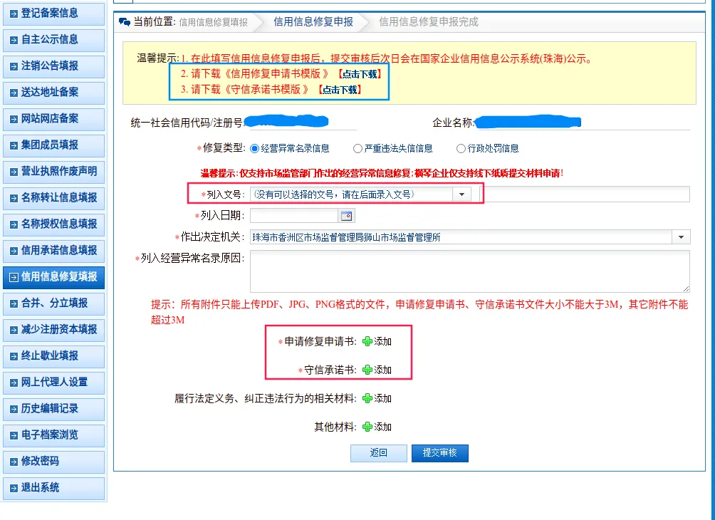 ③登录市场主体登记自助服务系统,选择左侧信用信息修复填报,点击信用信息修复申报,选择列入文书号,将基础信息填入《信用修复申请书》中,将《信用修复申请书》《守信承诺书》签字、盖公章后,拍照上传至对应上传入口,并提交审核。