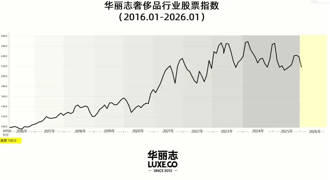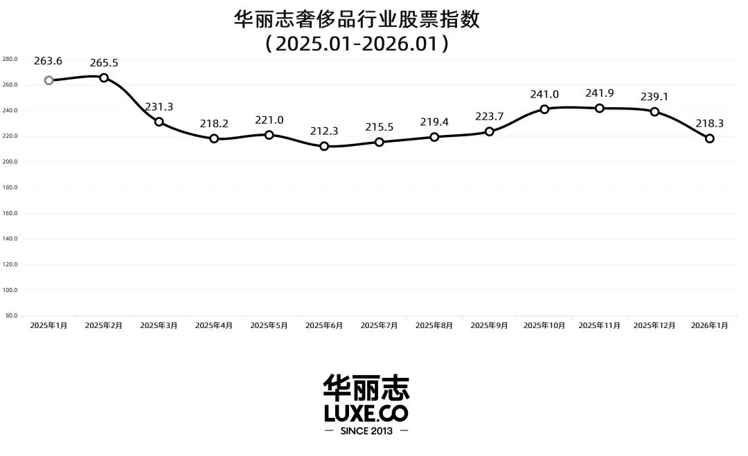 受此影响,和2025年12月底相比,2026年1月底“华丽志奢侈品行业股票指数”由239.1下跌8.7%至218.3,开局不利。
