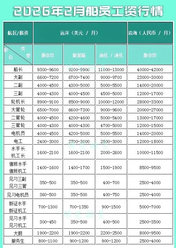 季节因素也来“凑热闹”。春节前后,海员薪资呈现出明显的差异化波动。年前船东急聘补岗,薪资高涨,而年后则预计会回落一些,船员们也需要根据这个规律来合理规划自己的上船时机。