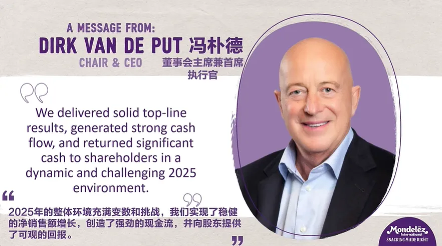 董事长兼首席执行官冯朴德(Dirk Van de Put) 强调:“2025年,我们在前所未有的可可成本压力下,凭借全球化布局、标志性品牌矩阵和高效供应链,实现了稳健的营收增长和强劲的现金流生成,并向股东返还了可观资本,彰显了业务的内在韧性。”