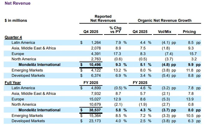 “定价提升与成本管控双轮驱动,核心业务韧性凸显”是亿滋国际2025年第四季度财报的核心关键词。