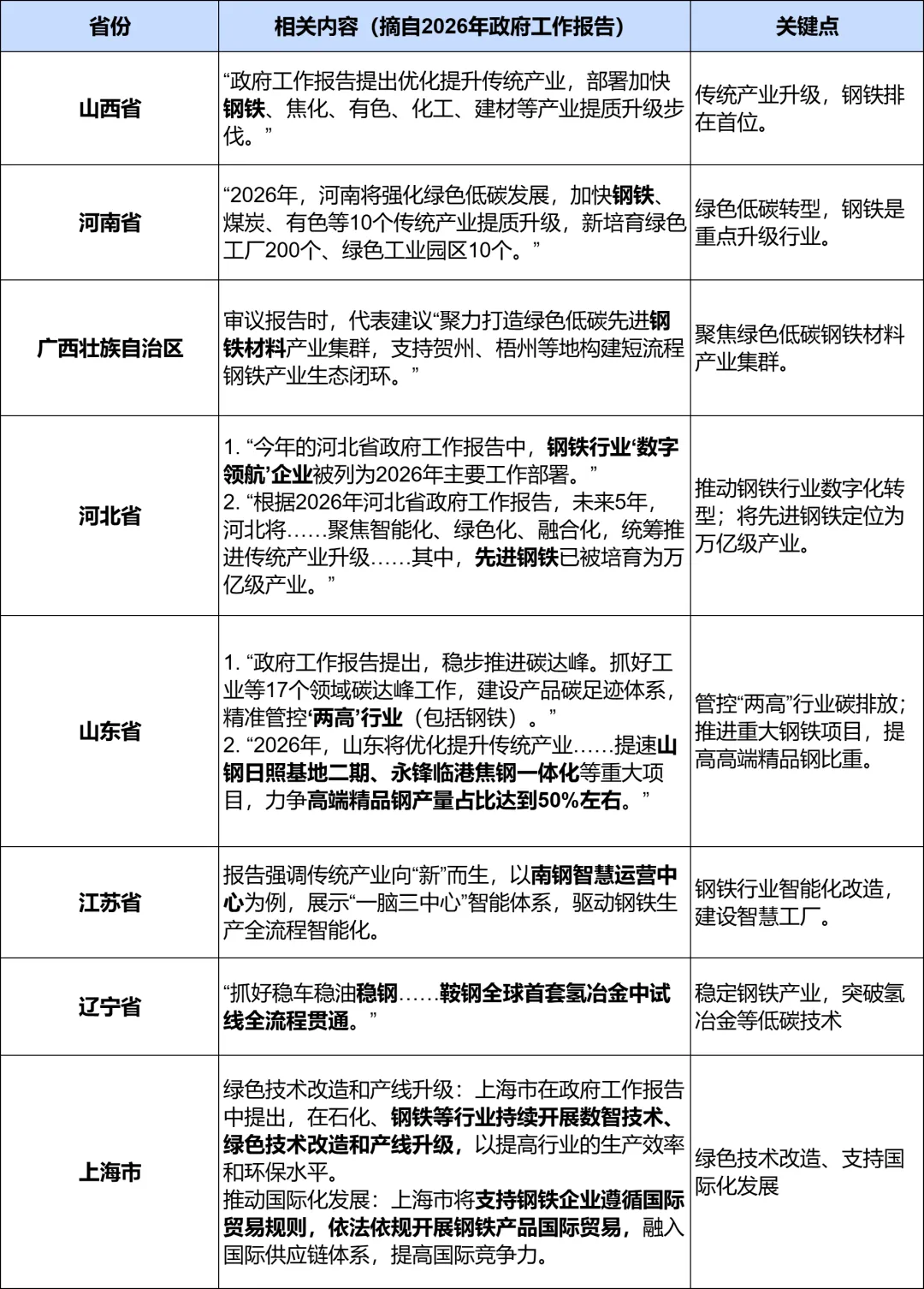 各省份2026年政府工作报告对钢铁行业的部署呈现共同趋势: