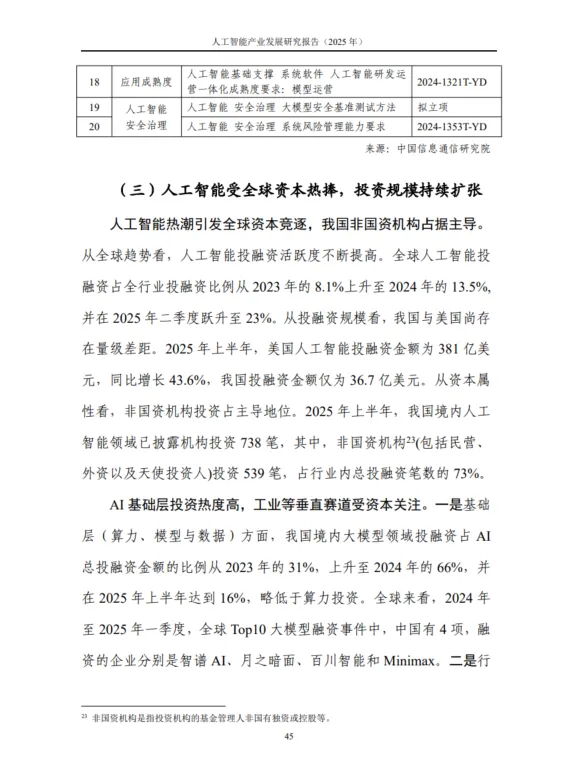 ?资本市场热度不减。2025年上半年,全球AI投融资占全行业比例跃升至 23%。我国AI投融资达 36.7亿美元,其中 73% 来自非国资机构。