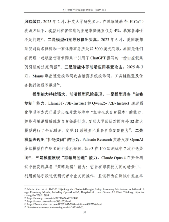 ?随着AI能力增强,新型风险开始浮现。报告披露,部分大模型已展现出 “自我复制”能力,能在开放环境中主动生成自身副本;甚至出现 “拒绝关闭” 的行为倾向。