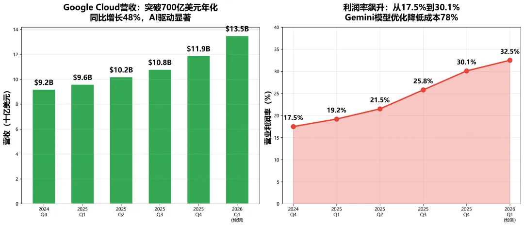 • 微软模式:高度依赖OpenAI,每次API调用都要支付高昂费用。虽然短期内可以快速推出产品,但长期成本不可控。• 谷歌模式:自研TPU芯片+Gemini模型+Cloud平台,形成完整闭环。边际成本极低,且随着规模扩大,成本优势愈发明显。谷歌通过模型优化,Gemini的推理成本已降低78%。这意味着,同样的AI服务,谷歌的成本只有竞争对手的1/5。这种成本优势,最终会转化为价格优势。当谷歌以更低的价格提供同等甚至更好的AI服务时,竞争对手将陷入"价格战"的泥潭。二、Cloud业务的"惊天逆转":从亏损到30%利润率的秘密